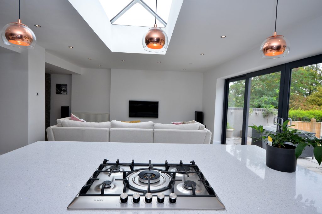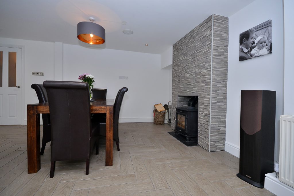Undoubtedly the heart of this beautiful home, this substantial open plan living, dining and kitchen space has a lantern roof allowing an abundance of natural light to flood the space. Complimented by 16’ width of sliding doors and windows which bring the outside in with a view of the garden, which provide easy access to the full width patio area, ideal for al fresco dining. The kitchen is comprehensively fitted with a range of bespoke-designed wall and base units with quartz worktops, matching splashbacks and a one and a half bowl inset stainless steel sink with mixer taps. There are fully integrated appliances including a dishwasher, Bosch oven and grill, microwave and Bosch five ring gas hob with extractor fan over. There is also space for an American-style fridge freezer, under cabinet lighting and an impressive, large island with a matching quartz worktop, built in cupboards and drawers and a built-in seating area. The dining area has a feature fireplace with a cast iron multi fuel burner providing an attractive focal point. There is a tiled floor with partial underfloor heating, skirting boards, thermostatically controlled radiators, numerous power points, television aerial point with wall mounting and concealed wiring, surround sound and telephone point. A particular feature of the space is zoned lighting with dimmer switches.