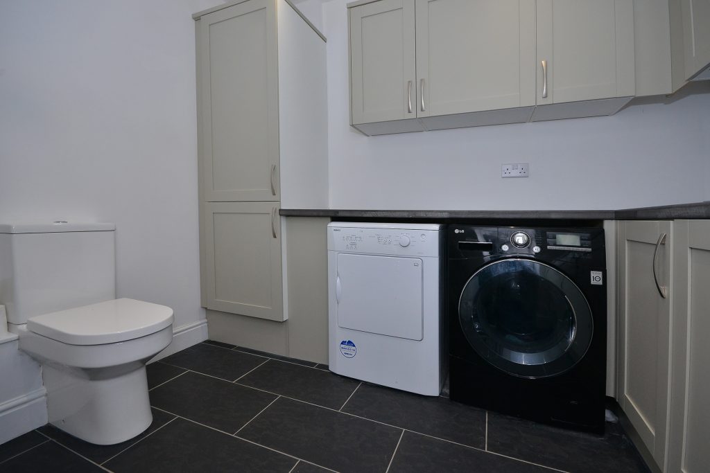 This useful utility room is comprehensively fitted with a range of wall and base units with roll top work surfaces, composite sink with mixer tap, ceiling spot lights, extractor, floor tiling with underfloor heating, space and plumbing for washing machine, space for tumble drier, chrome towel rail radiator and close coupled W.C..