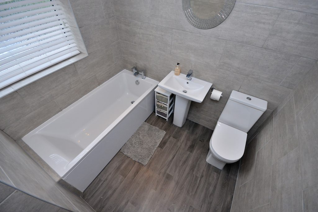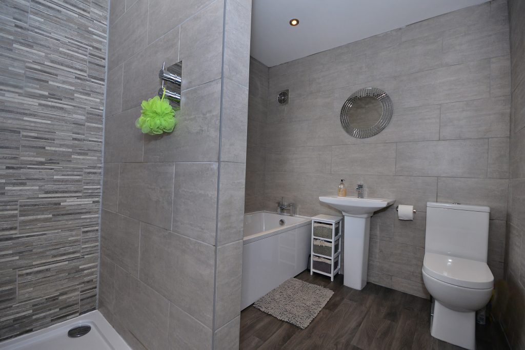 Refitted family bathroom with a four piece suite comprising a double shower enclosure with monsoon shower head, white panelled bath with waterfall mixer tap, pedestal wash hand basin with waterfall mixer tap and close coupled W.C.. Extractor, ceiling spotlights, chrome towel rail radiator and UPVC double glazed opaque window to the rear.