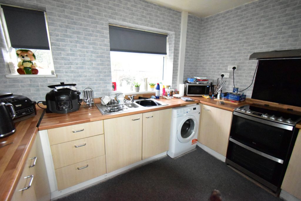 With a range of wall and base units with roll top work surfaces, 1 ½ bowl stainless steel sink, space and plumbing for washing machine, built in extractor fan over with space for oven, space and plumbing for washing machine, power points, ceiling light point and two double glazed window to the rear. With access to utility store and inner lobby with under stairs storage.