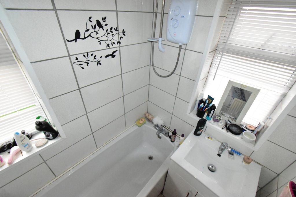 With wash hand basin set into vanity unit, bath with shower over, double glazed windows to side and rear, wall tiling and ceiling light point.