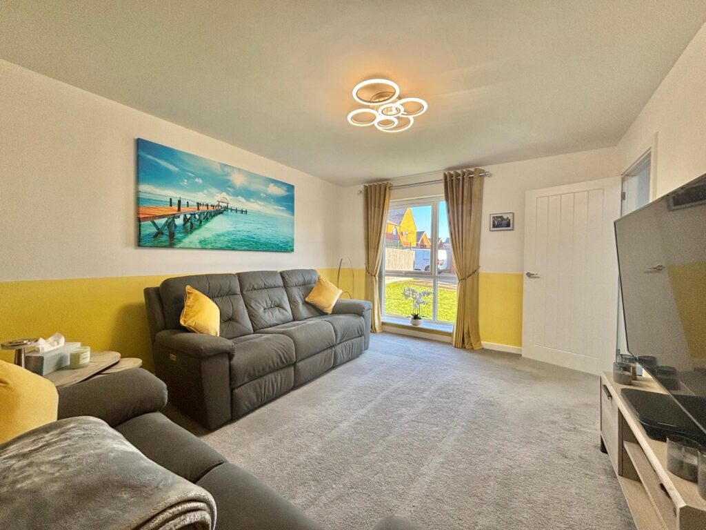 With carpet, radiator, TV point, ceiling light point and window to front elevation and a cupboard.