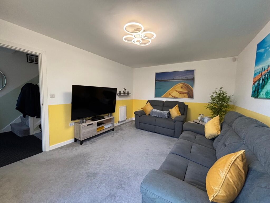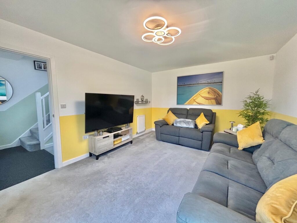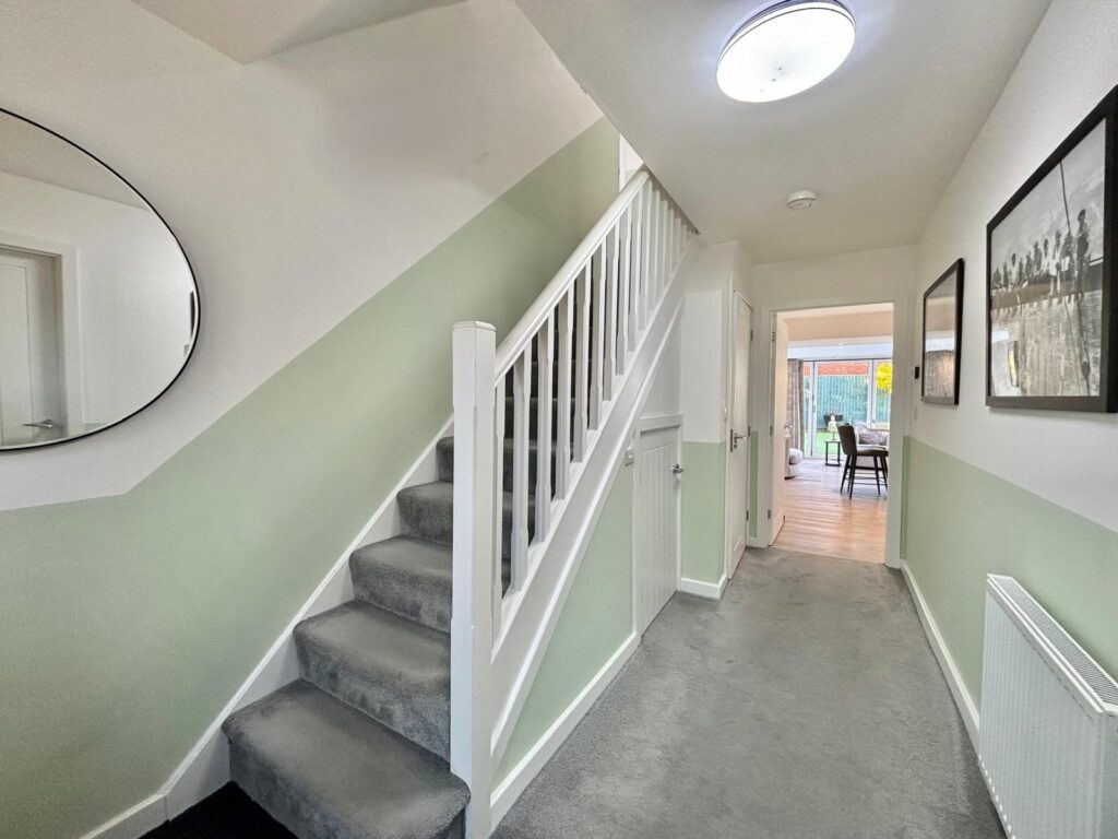 With composite front door, carpet to flooring, central heating radiator, staircase leading to the first floor, and access to:
