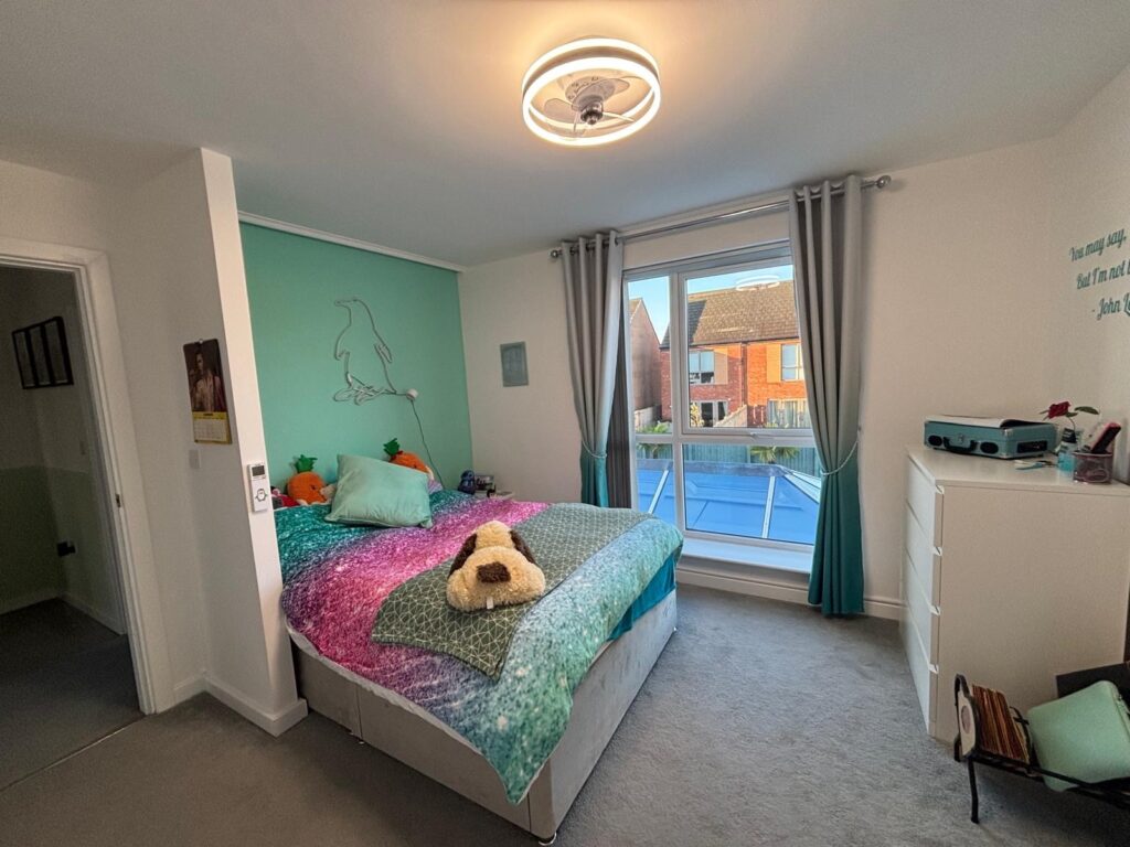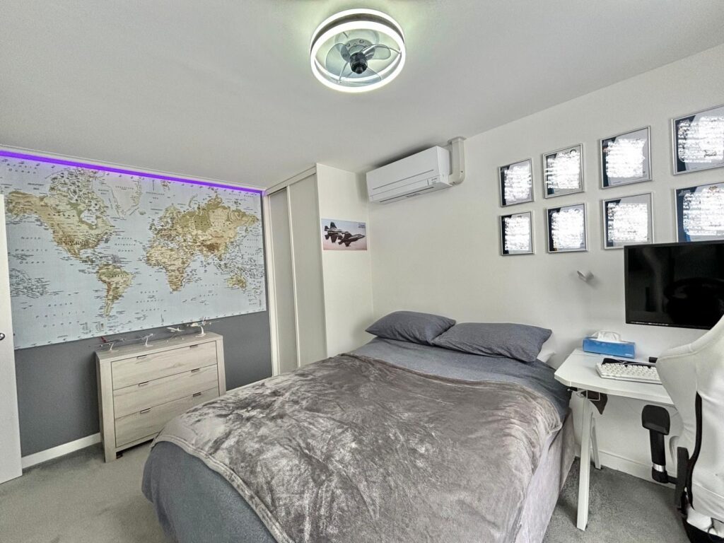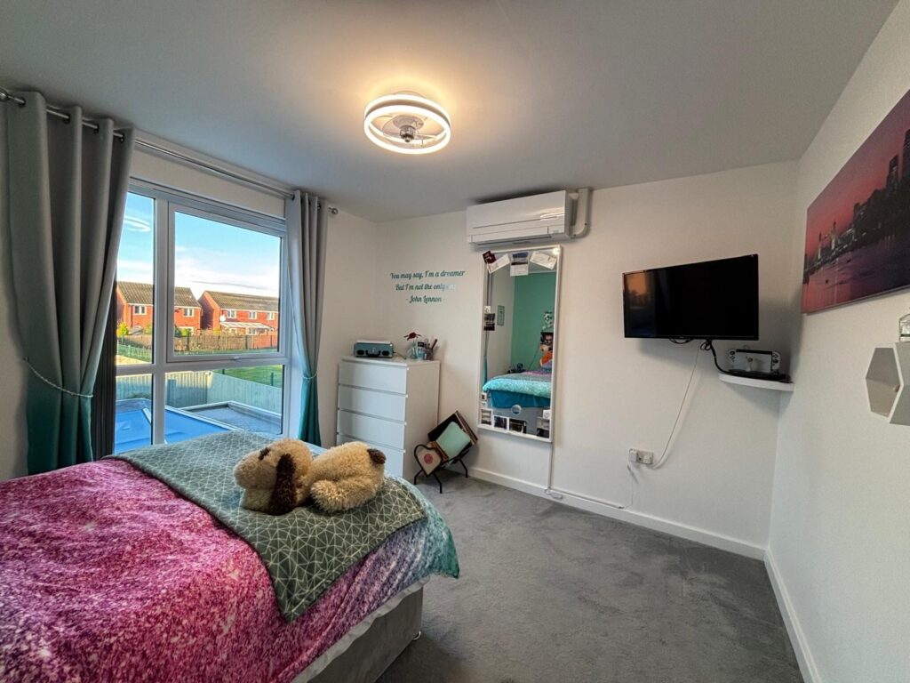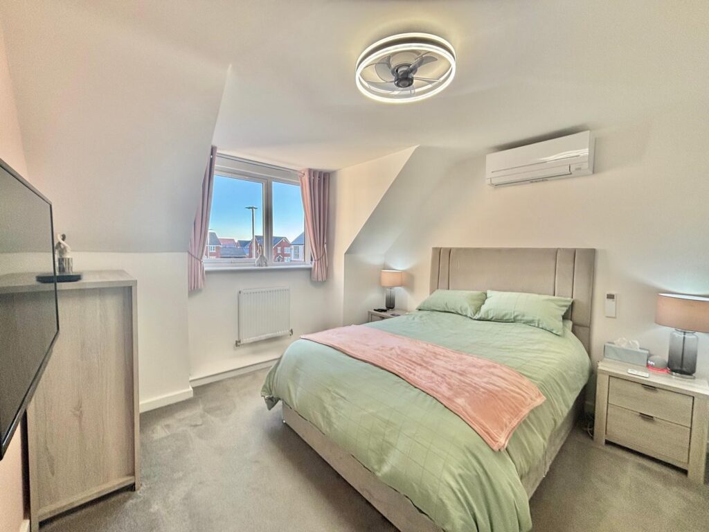 With carpet, radiator, air-conditioning, fitted wardrobes with double rail, ceiling light point, TV point and window to the front elevation.
