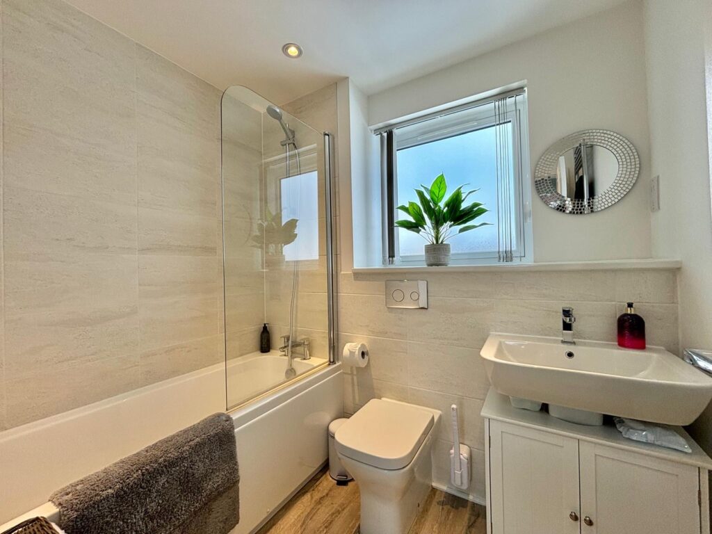 Including a panelled bath with shower over, wall hung basin, low flush WC, full height tiling, electric heated towel rail, shaver point and ceiling light point and window to rear elevation.