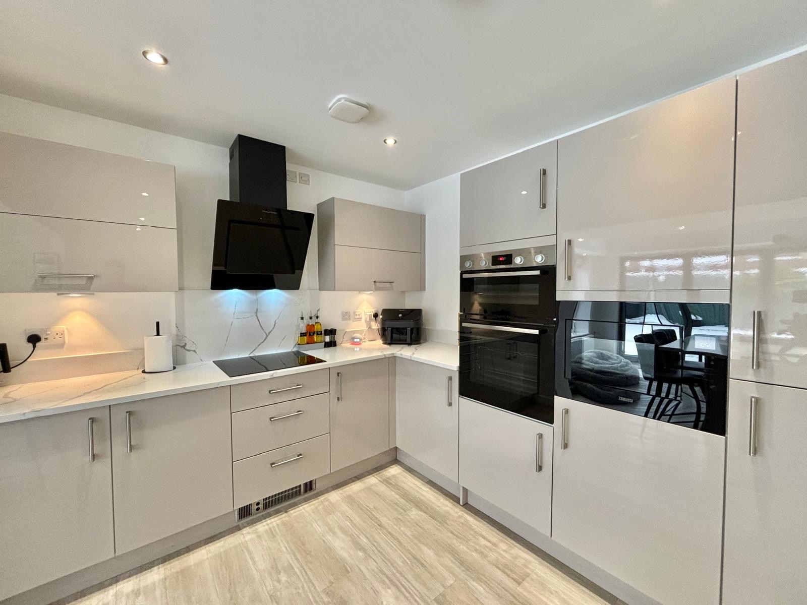 With sleek cabinets and units, induction hob, splash back, extractor fan, double integrated oven, microwave, fridge freezer, dishwasher, centre island with an inset sink and work surface. Along with down lights, a door leading the garage.