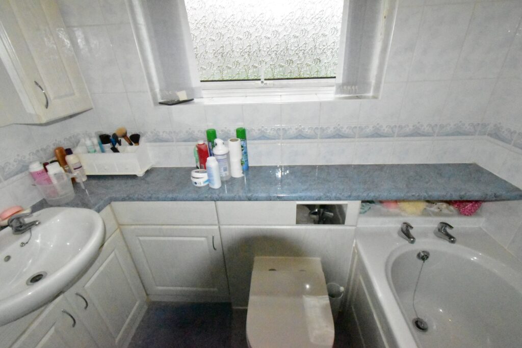 White suite comprising of a wash hand basin built into vanity, W.C. and bath with shoer over, fully tiled walls, UPVC double glazed window to the rear, radiator and ceiling light point.