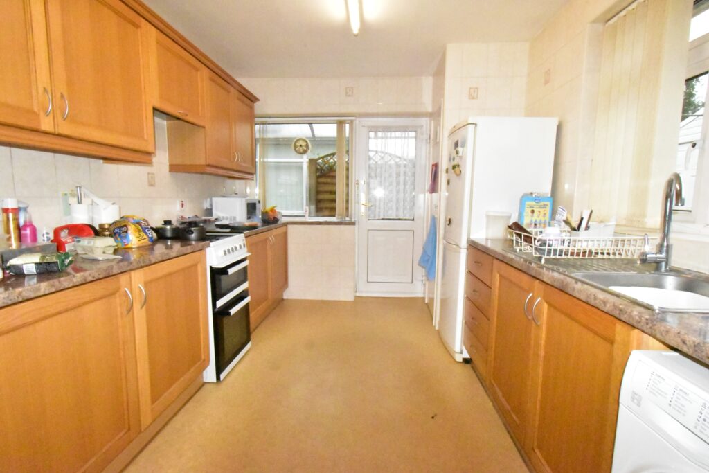 Fitted with a range of wall and base units in a wood effect finish with coordinating roll top work surfaces, fully tiled walls, space and plumbing for a washing machine, space and plumbing for a fridge freezer, space and fittings for an oven, extractor fan, single drainer sink with mixer tap, UPVC double glazed window to the rear, UPVC double glazed door to the side, radiator, power and ceiling light points.
