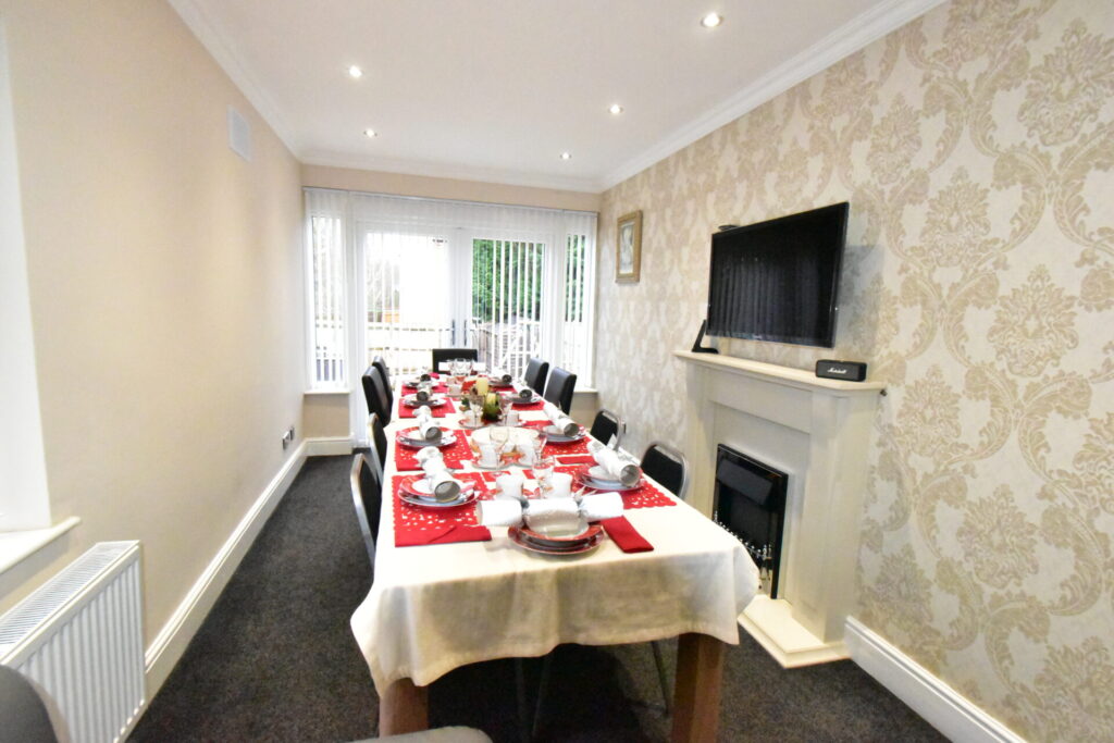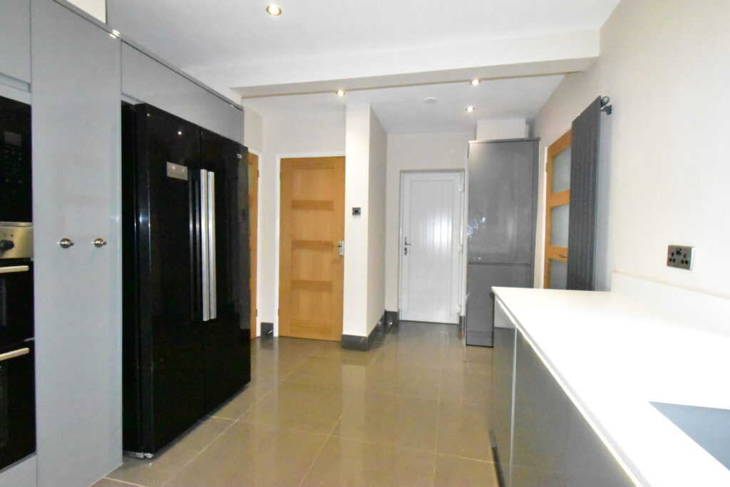 Fitted with a range of wall and base units in a grey, high gloss finish with coordinating quartz work surfaces, space and plumbing for a washing machine, space and plumbing for an American style fridge freezer, integrated microwave, integrated dishwasher, integrated electric double oven, five ring gas hob, extractor fan, sink with mixer tap, all appliances are “A” rated and the kitchen was fully refurbished in March 2024, access to the dining room, underfloor heating, UPVC double glazed window to the rear, UPVC door to the side, radiator, power points and ceiling spotlights.