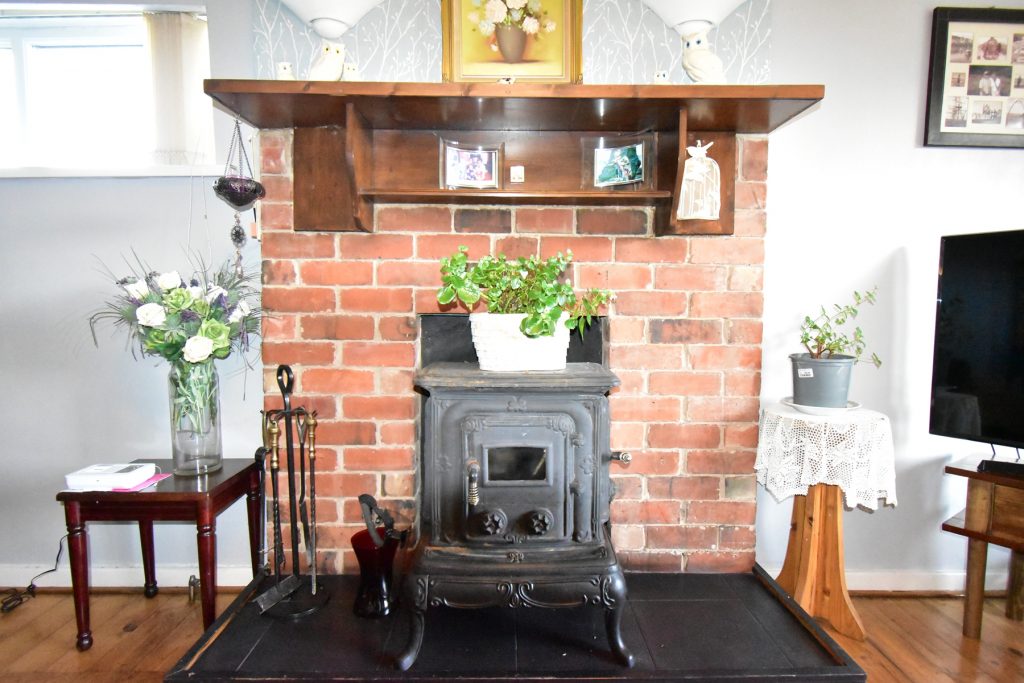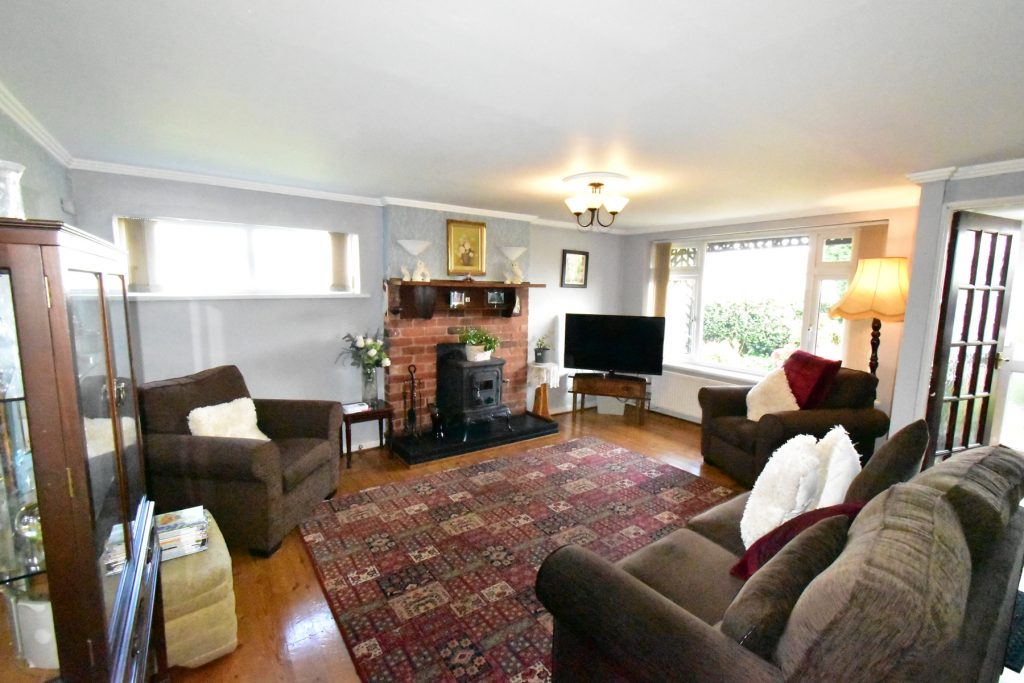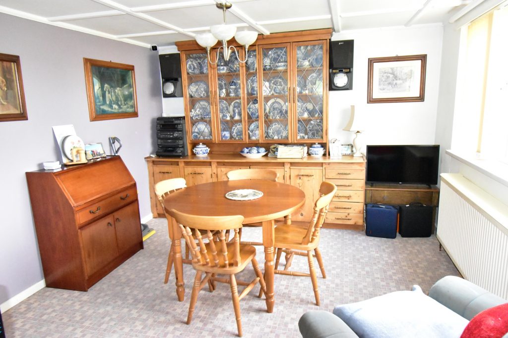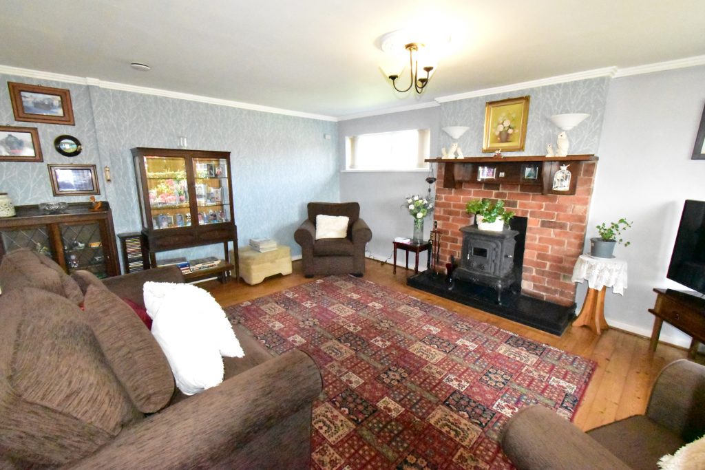 A spacious family room with windows to the front and side, brick built feature fireplace, access to the dining room, radiator, power and ceiling light points.