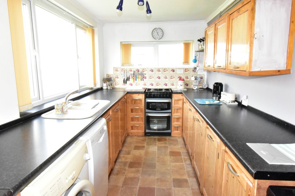 Fitted with a range of wall and base units in a wood finish with coordinating roll top work surfaces, part wall tiling, space and plumbing for a washing machine, space and plumbing for a fridge freezer, space and plumbing for a dishwasher, space and fittings for an oven, one and a half bowl single drainer sink with mixer tap, windows to the side and rear, radiator, power and ceiling light points.