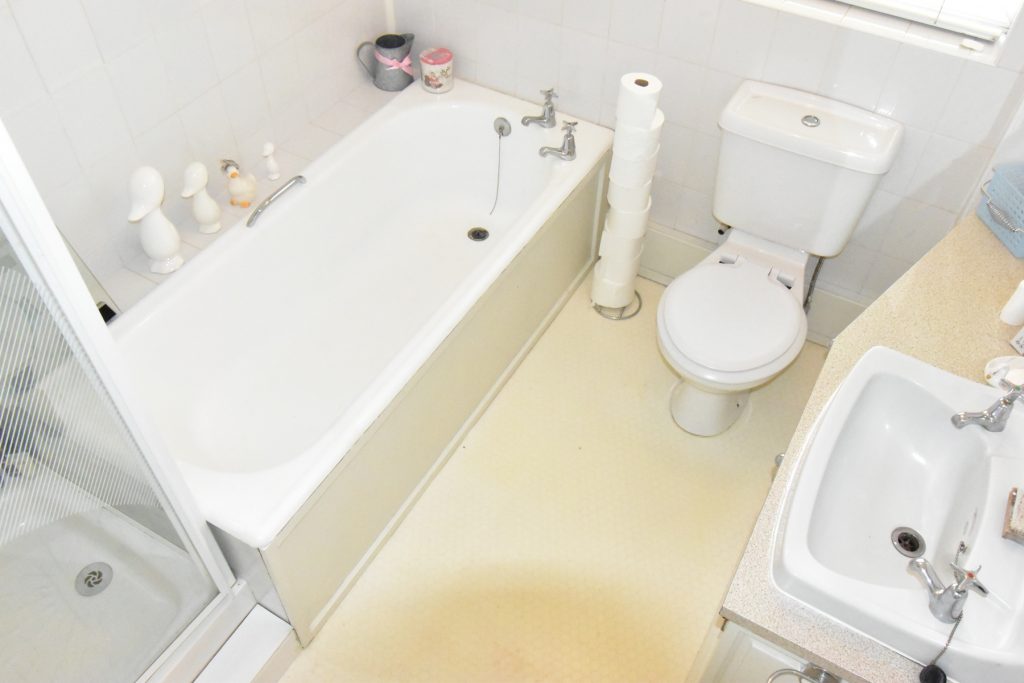 Fitted with a white four piece suite comprising of a wash hand basin built into vanity, W.C., bath and separate shower cubicle, part tiled walls, window to the rear, radiator and ceiling light point.