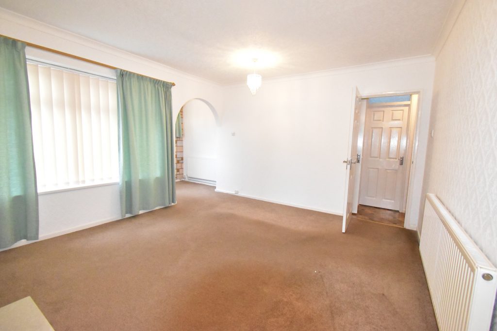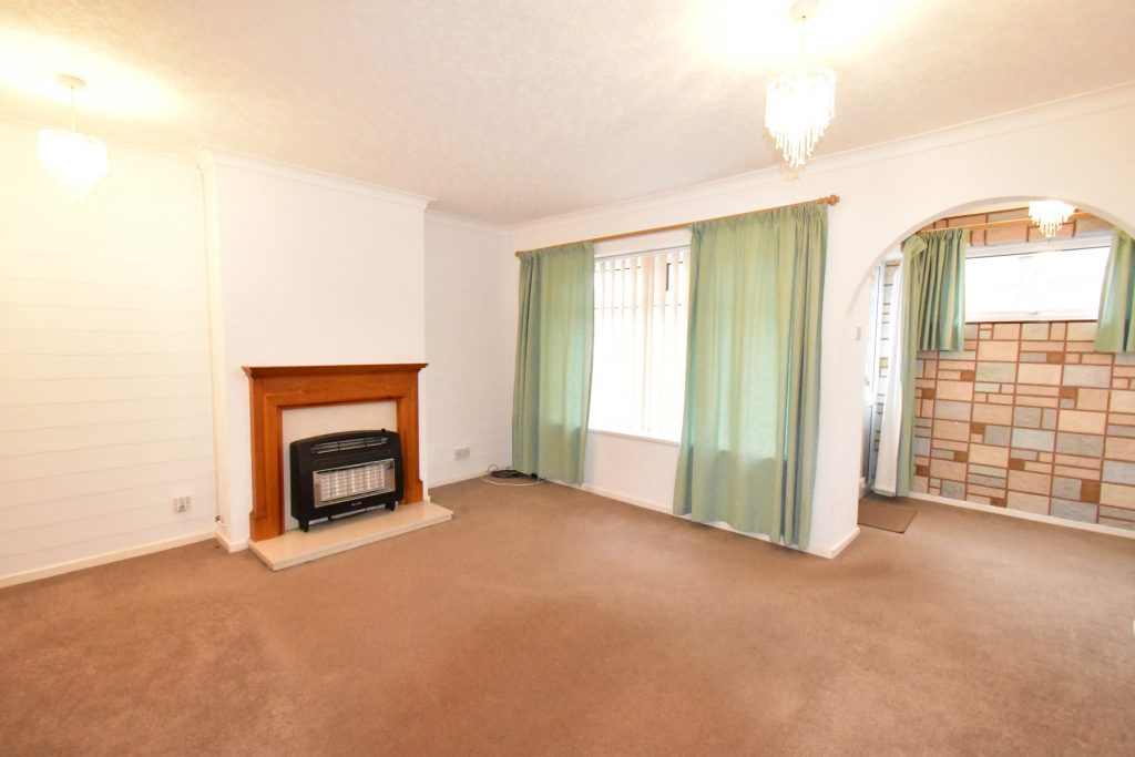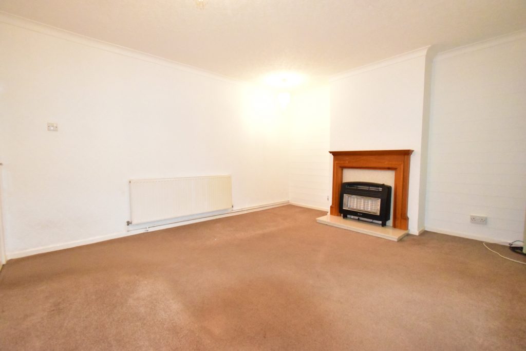 A spacious family room with window to the front, ceiling coving, gas feature fireplace, radiator, power and ceiling light points
