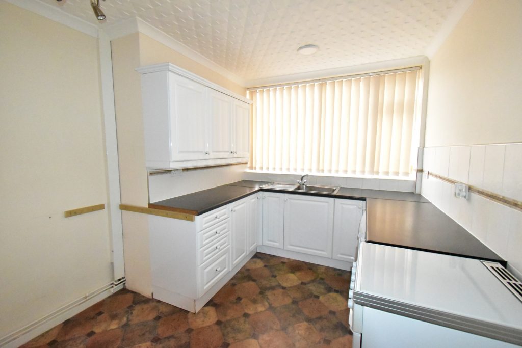 Fitted with a range of wall and base units in a white gloss finish with coordinating work surfaces, part wall tiling, space and plumbing for a fridge freezer, space and plumbing for a washing machine, space and fittings for an oven, single drainer stainless steel sink with mixer tap, UPVC double glazed window to the front, UPVC door, radiator, power and ceiling light points.