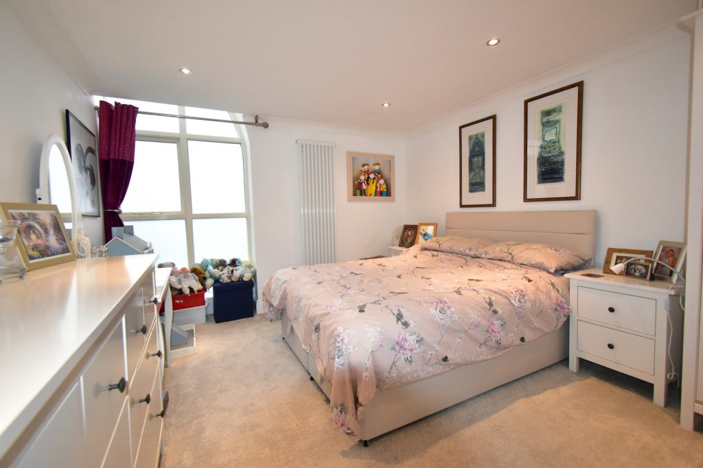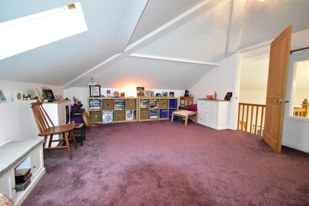 This fabulous master bedroom has feature sloping ceiling, Velux roof window, stained glass window overlooking the first floor, built in storage cupboards, ceiling light point and radiator.