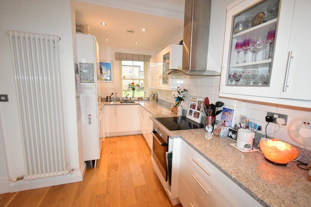 Finished in a high white gloss there are a range of wall and base units with granite effect roll top work surfaces and subway style tiled surround. The kitchen boasts a number of integrated appliances to include a fridge-freezer, electric oven and four ring electric hob with stainless steel extractor over along with an inset sink with chrome mixer tap. There is a sash window to the front, ceiling spotlights, wooden flooring and two stylish radiators.