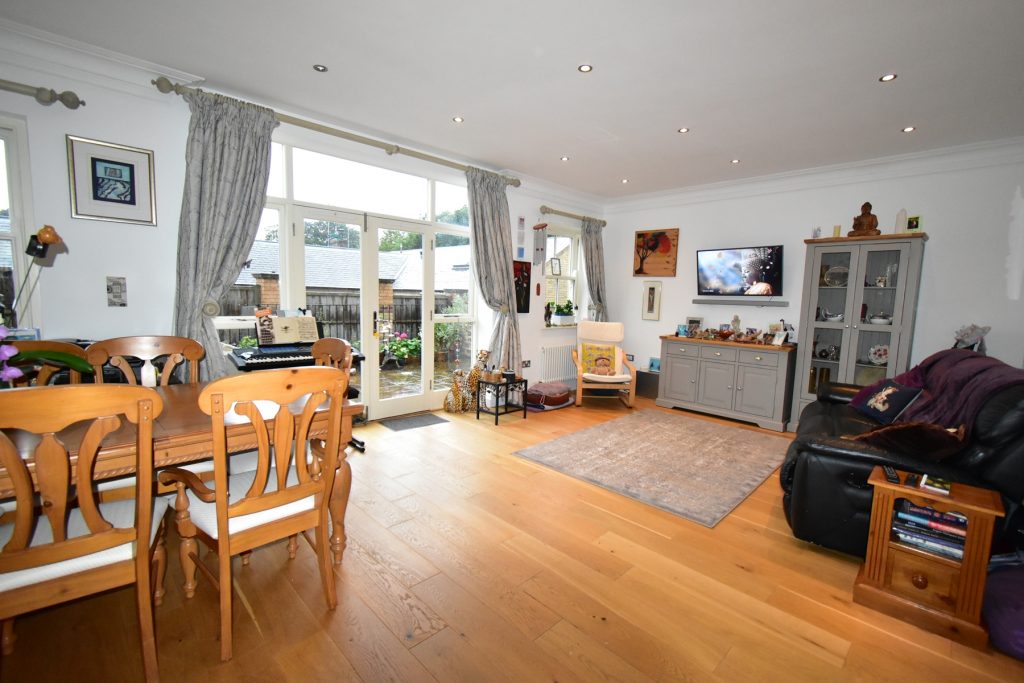 A spacious living room with a continuation of the wood flooring. There are large patio doors with windows either side and further windows overlooking the courtyard affording this room plenty of light. There is ample space for a dining set, lounge suite and storage furniture.