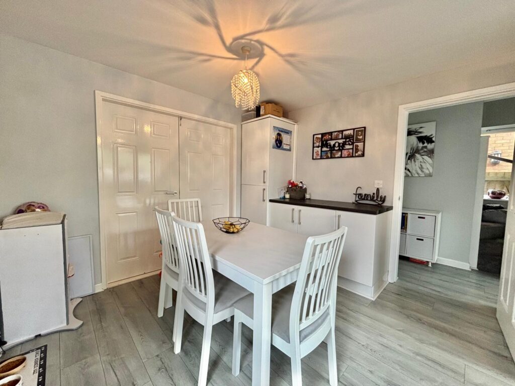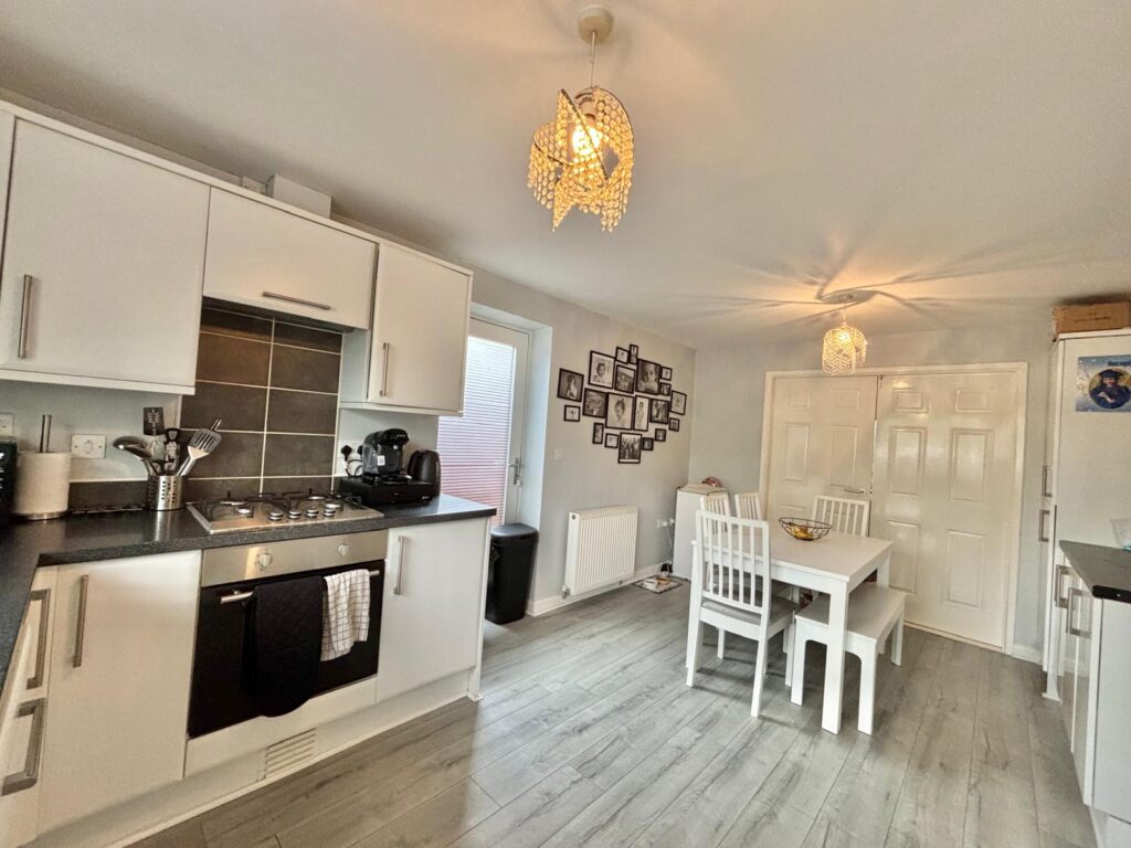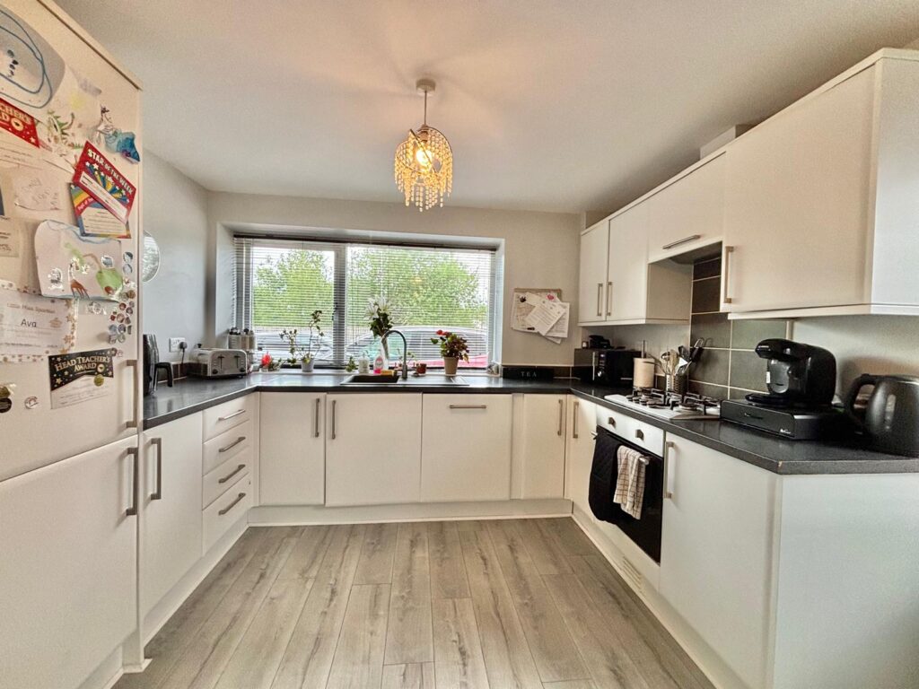 Fitted with a range of wall and base units in a white finish with coordinating work surfaces, part wall tiling, integrated fridge freezer, integrated dishwasher, integrated oven, four ring gas hob, extractor fan, single drainer sink with mixer tap, doors to the living room, UPVC double glazed window to the front, UPVC door to the side, radiator, power and ceiling light points.