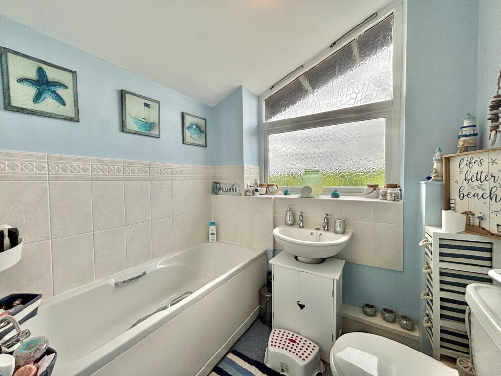 Whit suite comprising of a wash hand basin, W.C. and bath, part tiled walls, UPVC double glazed window, radiator and ceiling light point.