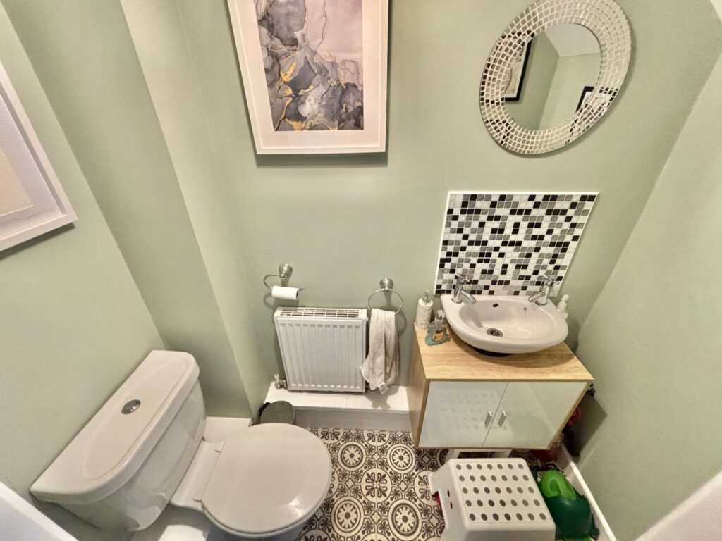 With wash hand basin built into vanity unit, W.C., radiator and ceiling light point.