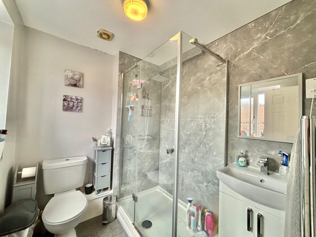 White suite comprising of a wash hand basin built into vanity, W.C. and a shower cubicle, part wall tiling, UPVC double glazed window, radiator and ceiling light point.