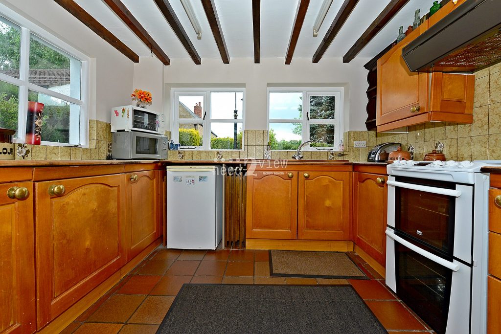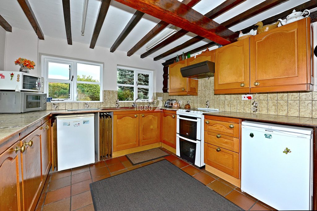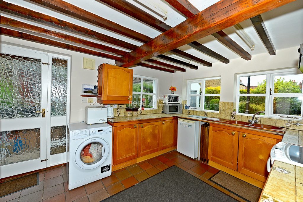 Fitted with a range of wall and base units in a wood finish with coordinating work surfaces, part wall tiling, space and plumbing for a fridge/freezer, space and plumbing for a washing machine, space and fittings for an oven, double sink with single drainer and mixer tap, window to the side of the property, windows to the side and rear, ceiling beams, radiator, power and ceiling light points.