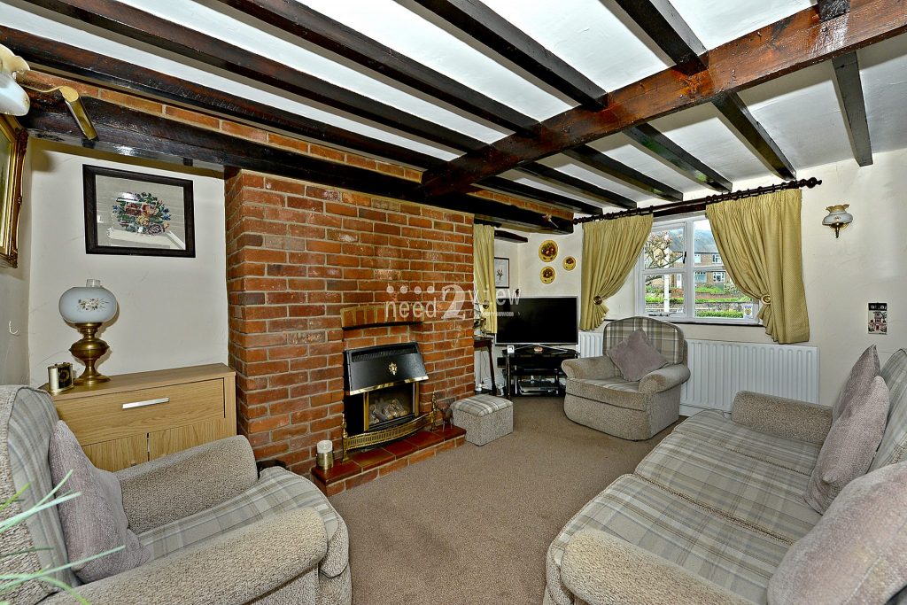 A spacious family room with windows to the front and side, bare brick feature fireplace, ceiling beams, radiator, power and wall light points.