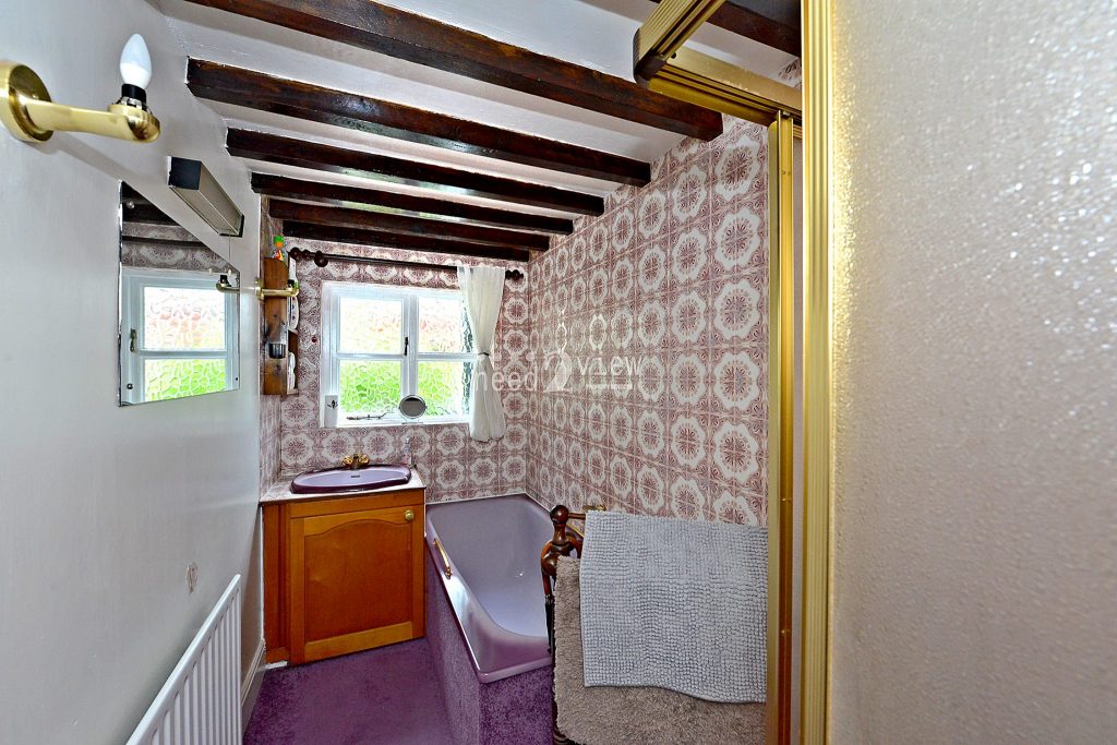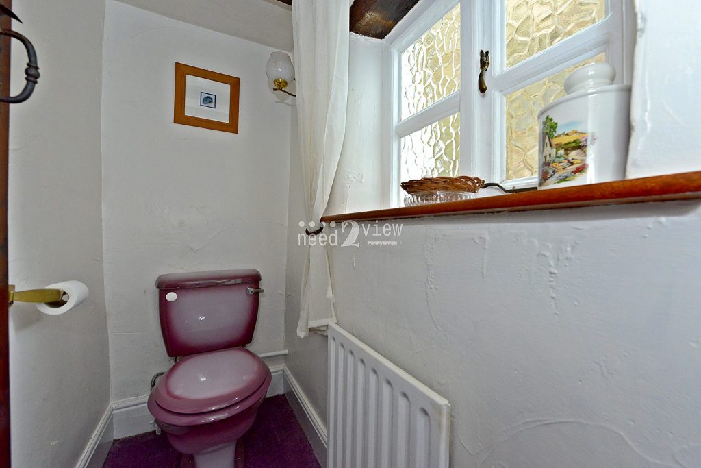 Separate to the bathroom, opaque window to the rear, purple W.C., ceiling beams, radiator and wall light point.