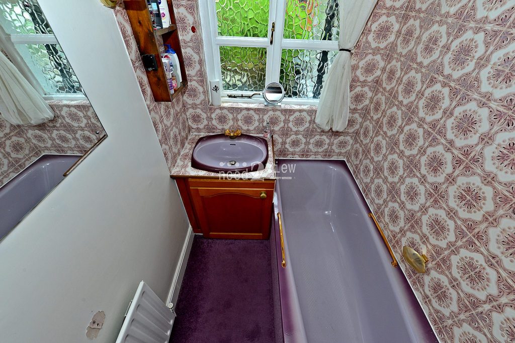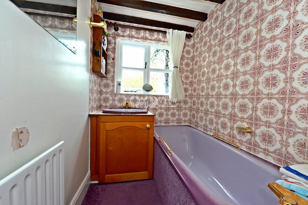 Ground floor bathroom with opaque window to the rear, purple bath, purple wash hand basin built into vanity, part tiled walls, ceiling beams, radiator and wall light point.