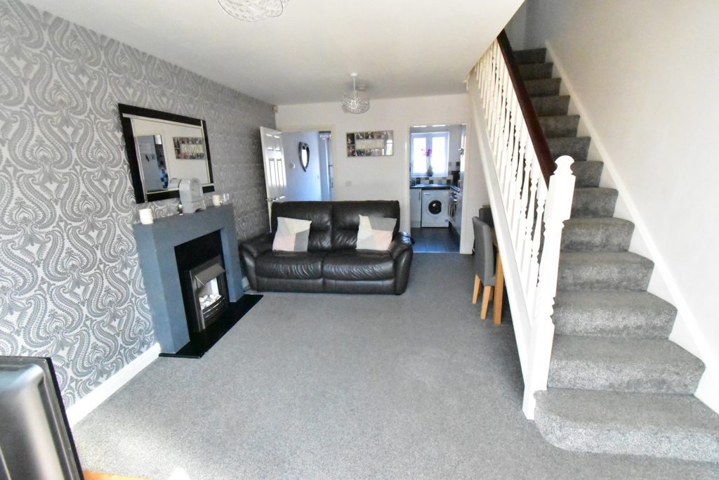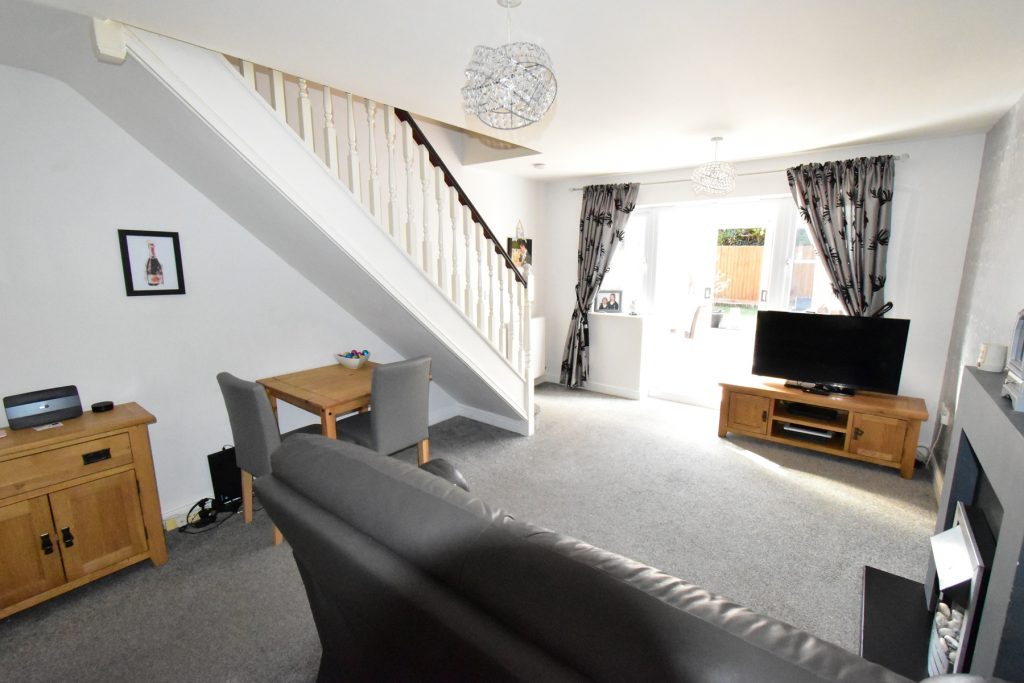 With patio doors to the conservatory, stairs to the first floor landing, feature fireplace, access to the kitchen, radiator, power and ceiling light points.