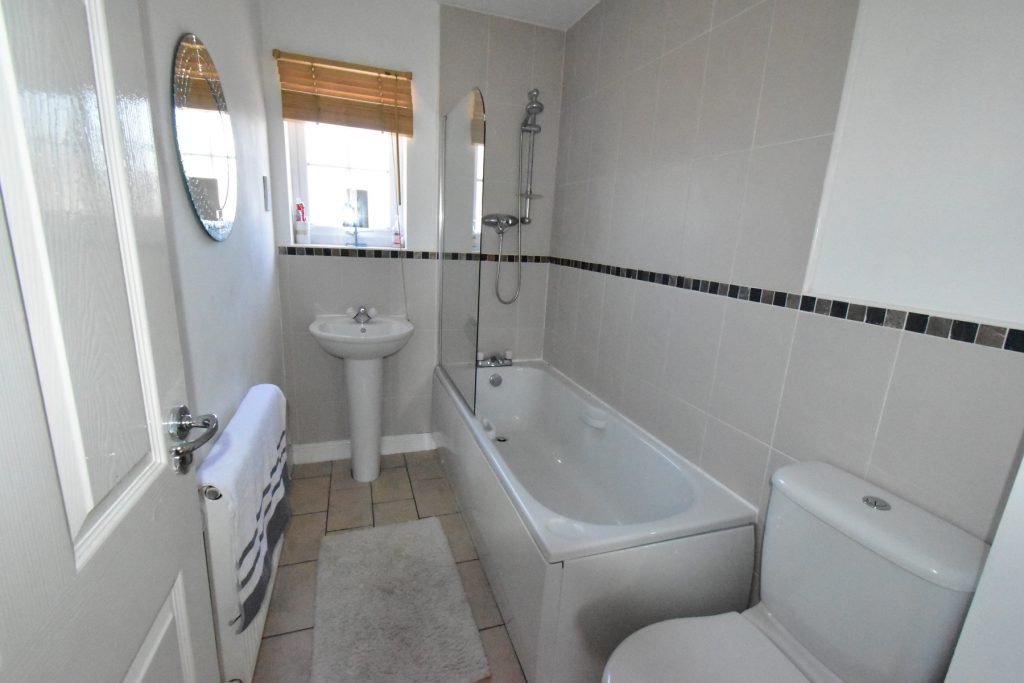 With window to the front, white three piece suite comprising of a W.C., wash hand basin, bath with shower over, radiator, power and ceiling light point.