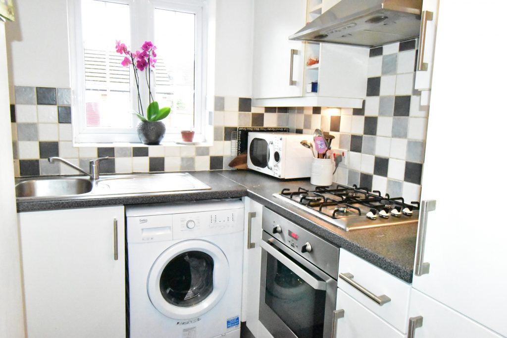 Fitted with a range of wall and base units in a white finish with coordinating work surfaces, part wall tiling, space and plumbing for a washing machine, space and plumbing for a fridge/freezer, integrated oven, four ring gas hob, single drainer sink with mixer tap, window to the front, radiator, power and ceiling light points.