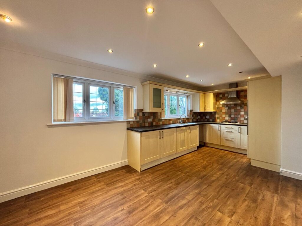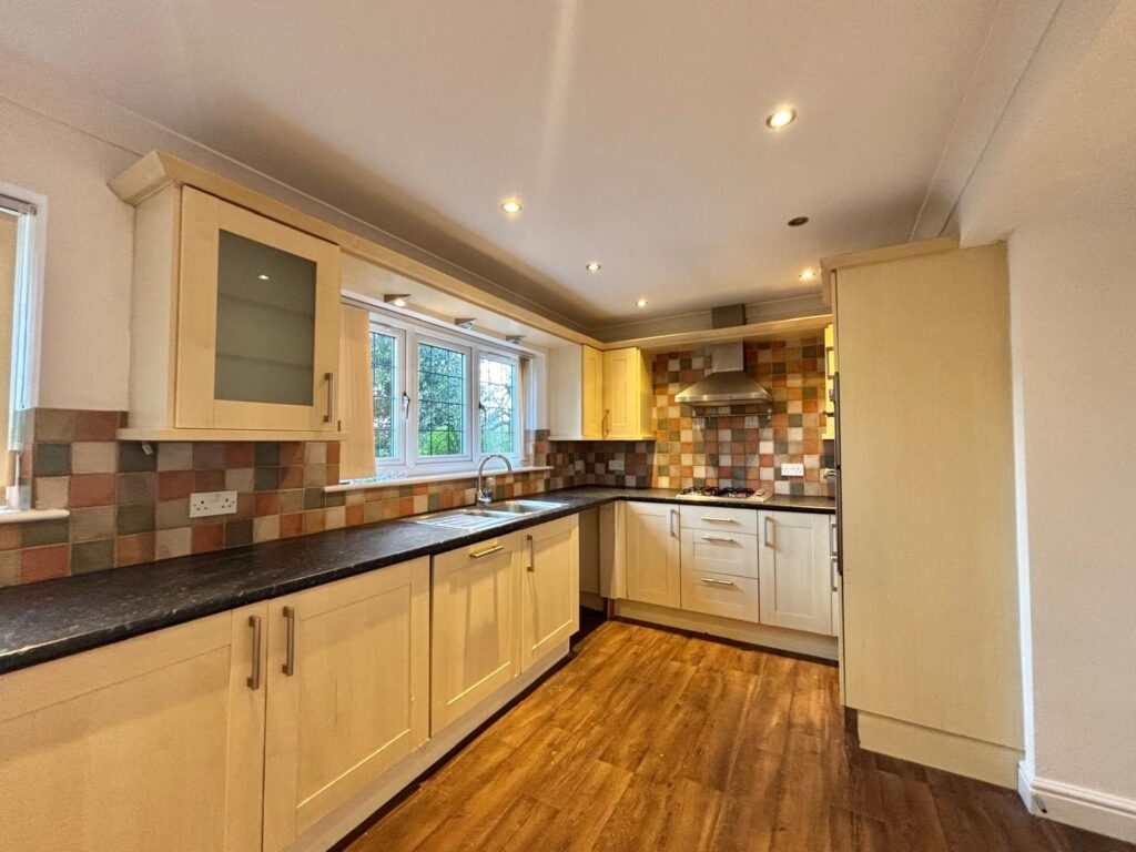 Fitted with a range of wall and base units in a wood effect finish with coordinating work surfaces, part wall tiling, space and plumbing for a washing machine, space and plumbing for a fridge freezer, integrated oven, four ring gas hob, extractor fan, one and a half bowl single drainer sink with mixer tap, UPVC double glazed window to the front, radiator, power points and ceiling spotlights.