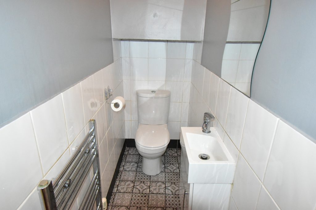 With wash hand basin, closed coupled W.C, chrome towel rail radiator, ceiling light point and tiled floor.