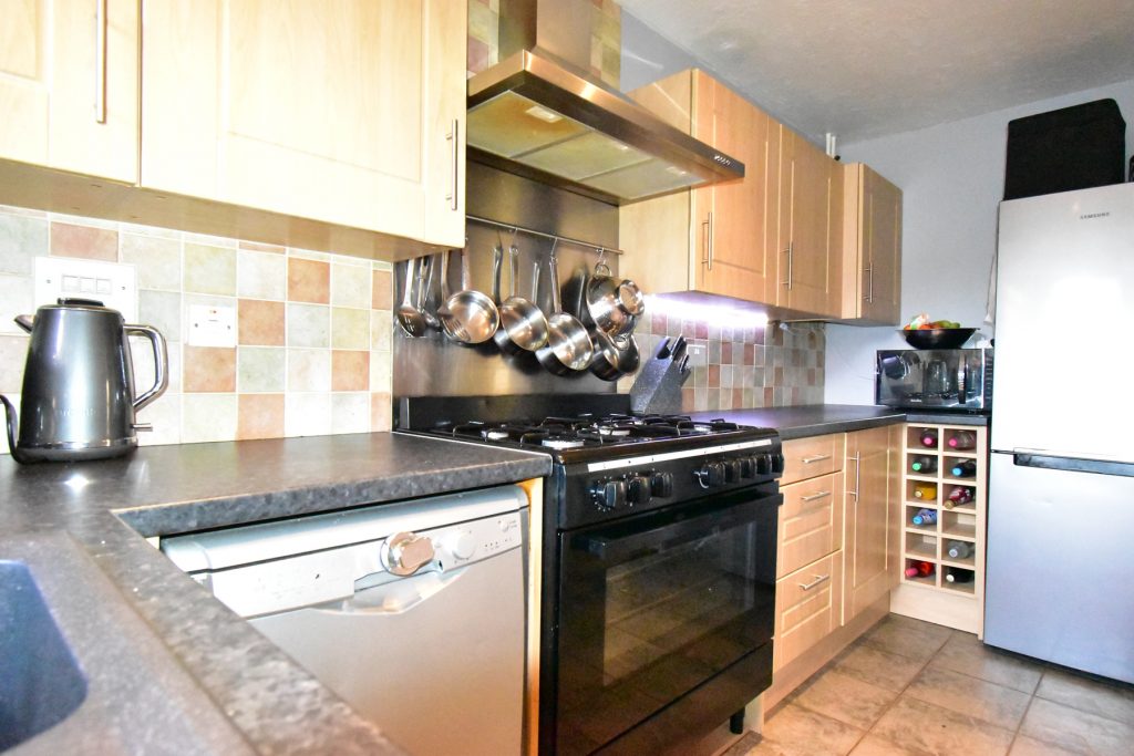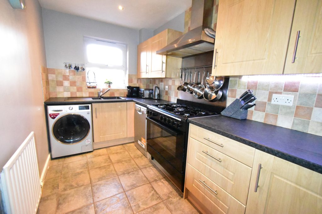 With a range of wall and base units with roll top works surfaces, five ring range style oven, space and plumbing for washing machine, space and plumbing for dish washer, space for fridge freezer, thermostatically controlled radiator, tiled floor, power points, ceiling spot lights and UPVC double glazed window to the front.
