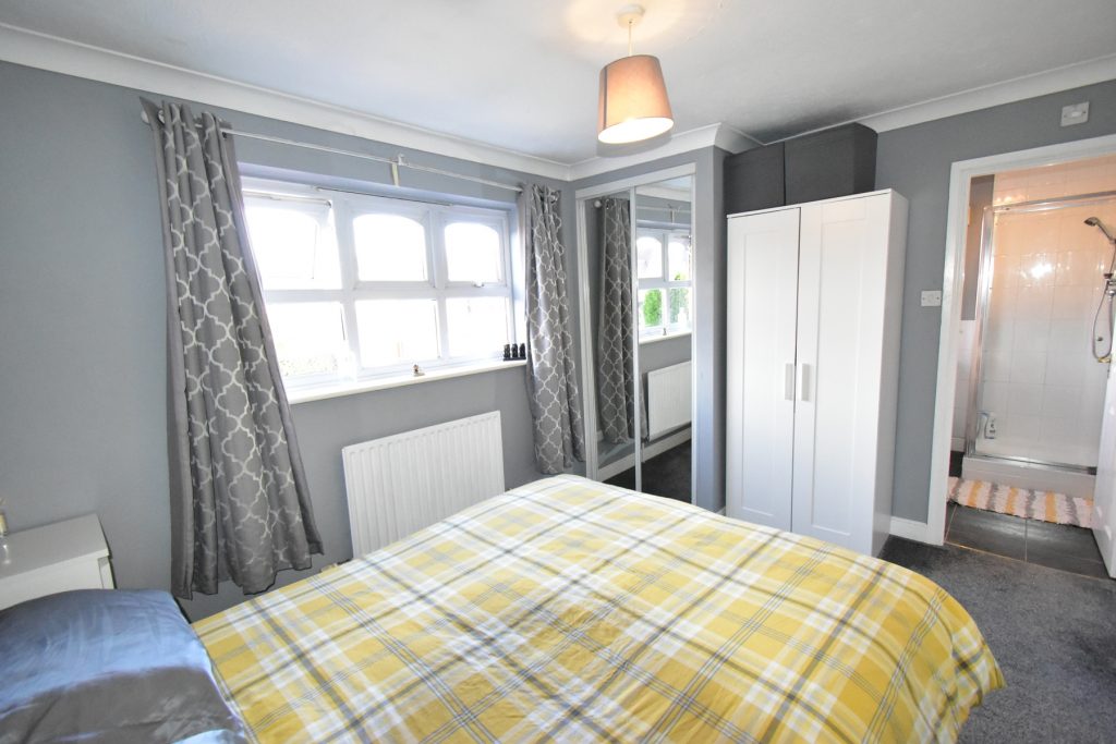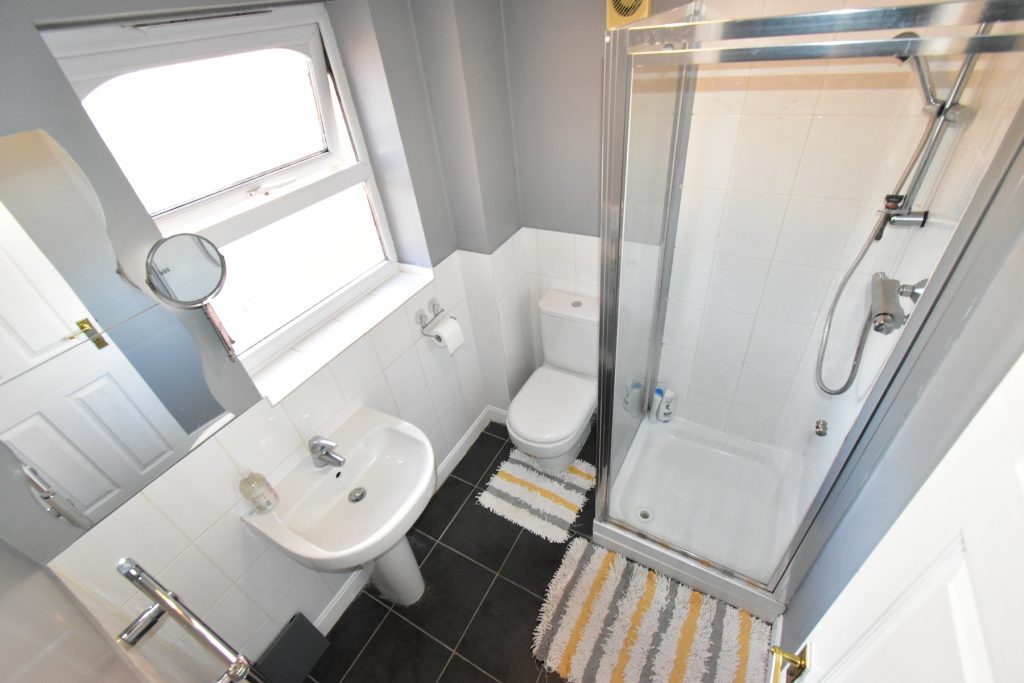With part wall tiling, floor tiling, UPVC double glazed window to the front, closed coupled W.C, pedestal wash hand basin, glazed shower cubicle, chrome towel rail radiator and ceiling light point.
