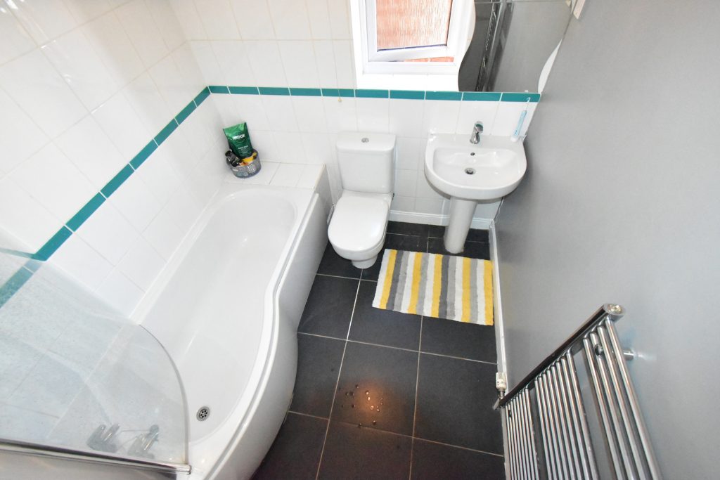 With part wall tiling, floor tiling, UPVC double glazed window to the side, closed coupled W.C, pedestal wash hand basin, sculptured bath, shower screen, electric shower over, chrome towel rail radiator and ceiling light point.