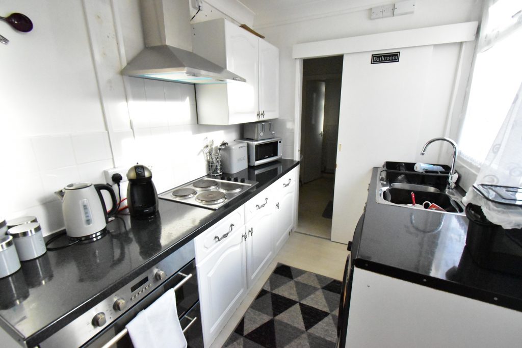 Fitted with a range of white wall and base units with coordinated work surfaces and wall tiling. There is a single drainer stainless steel sink with chrome mixer tap, integrated double oven and grill, surface mounted four point hob with extractor over, space for fridge/freezer, and space and plumbing for washing machine. The kitchen has a ceiling light point, and UPVC double glazed window and door to the side.