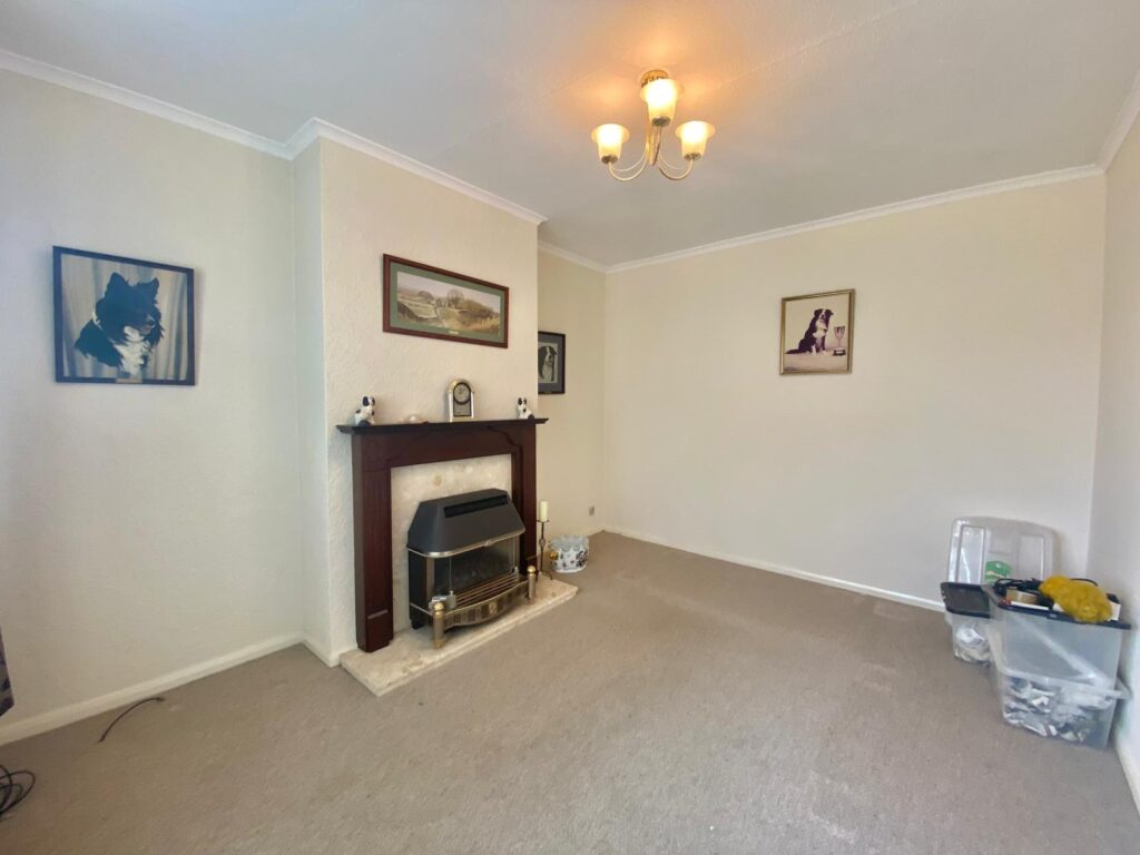 A spacious family room with window to the front, feature fireplace, radiator, power and ceiling light points.