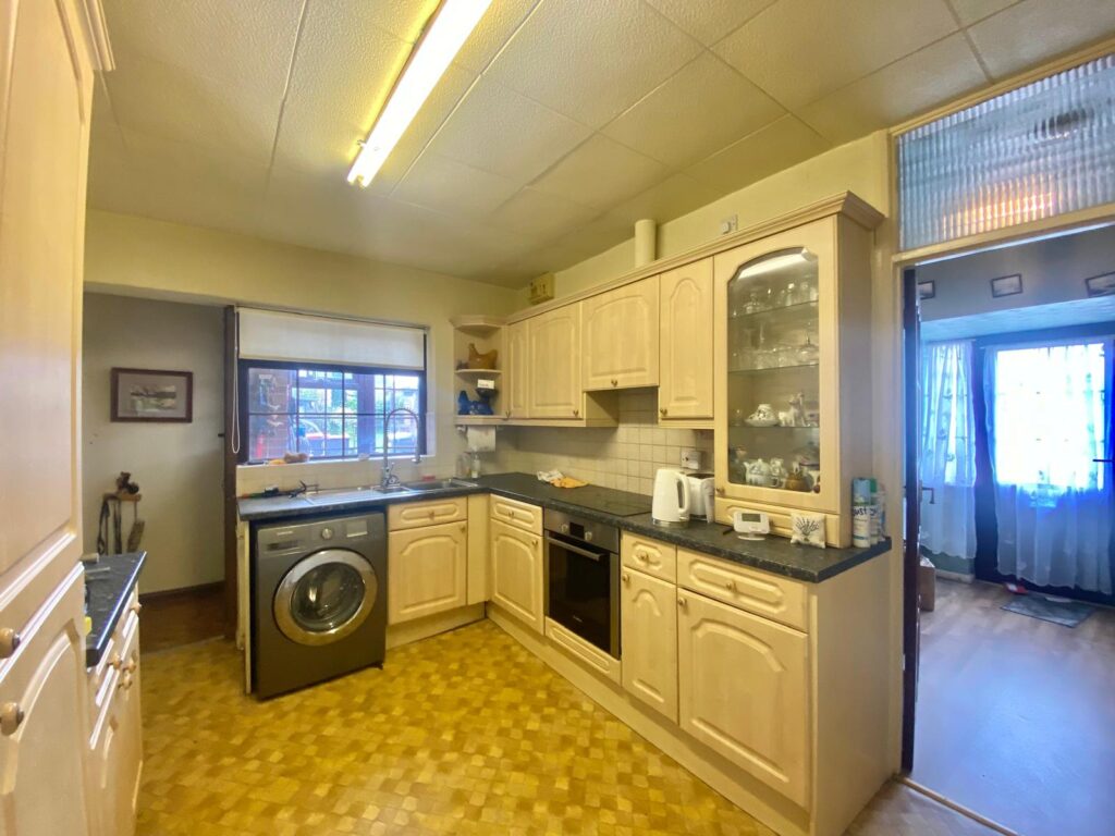 Fitted with a range of wall and base units in a light wood finish with coordinating work surfaces, part wall tiling, space and plumbing for a washing machine, integrated fridge freezer, integrated oven, four ring hob, extractor fan, one and a half bowl single drainer sink with mixer tap, window to the side, radiator, power and ceiling light points.