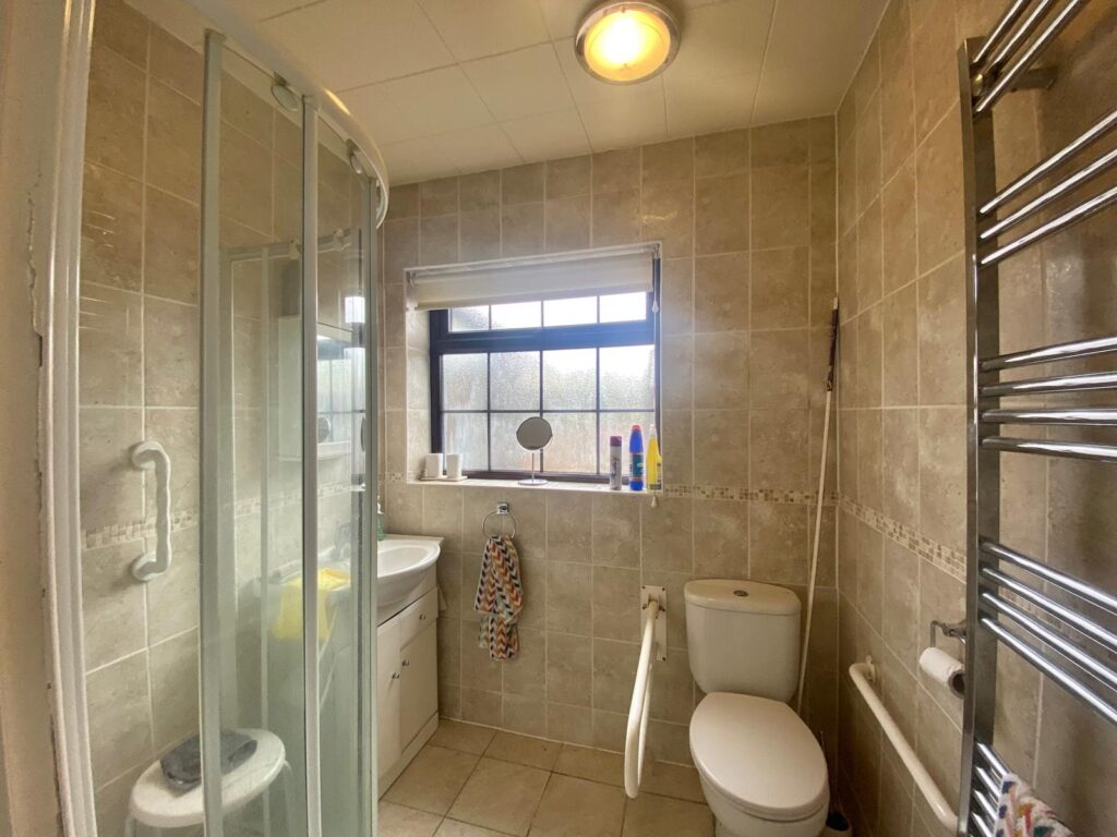 White suite comprising of a wash hand basin built into vanity, W.C. and a shower cubicle, fully tiled walls, opaque window, chrome towel radiator and ceiling light point.