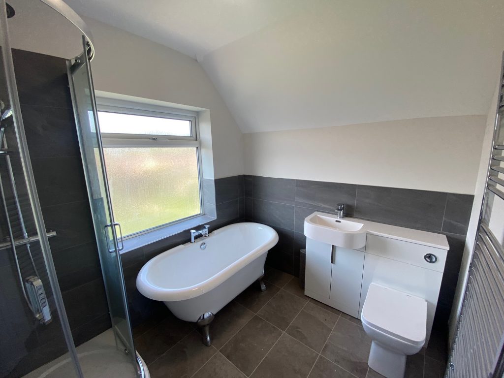 This stylish, newly refitted bathroom boasts a four-piece white suite comprising close coupled W.C. and wash hand basin with mixer tap set into vanity unit, free standing bath with mixer tap, shower enclosure with rainfall shower over, UPVC double glazed opaque window to the rear, towel rail radiator and ceiling light point.
