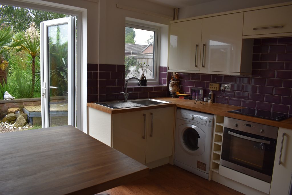 With double glazed window to the rear, double glazed patio doors, oak butchers block work surfaces, cream gloss wall and base units, stainless steel sink, integrated electric hob, integrated oven, tiled surrounds, space for fridge freezer, space and plumbing for washing machine, power points and ceiling light point.