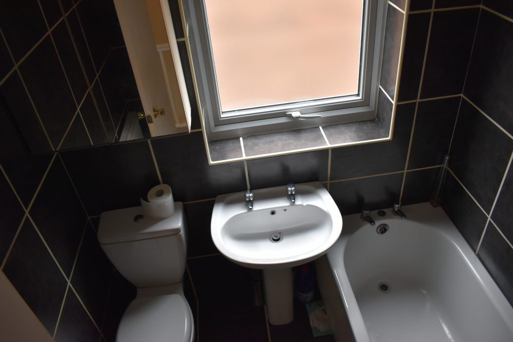 With three piece white suite comprising bath, wash hand basin, W.C, wall tiling, double glazed window and ceiling light point.