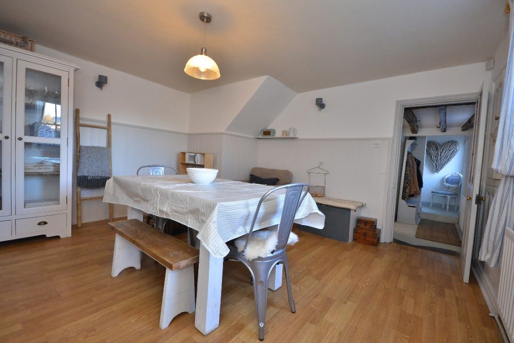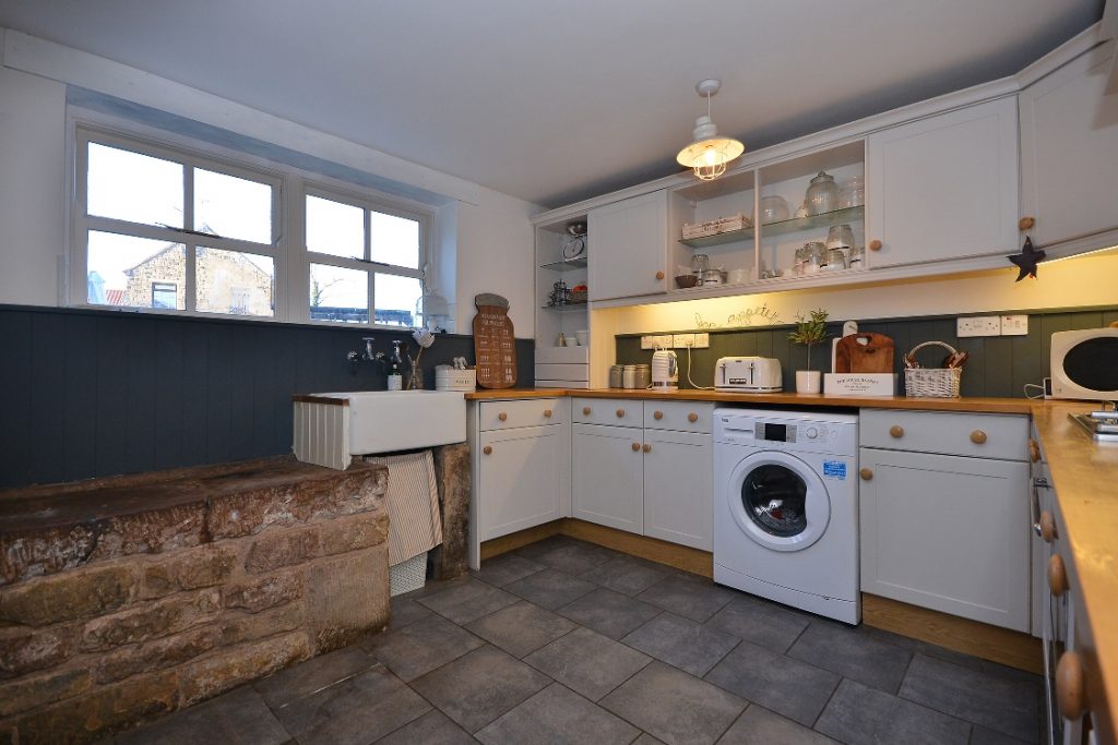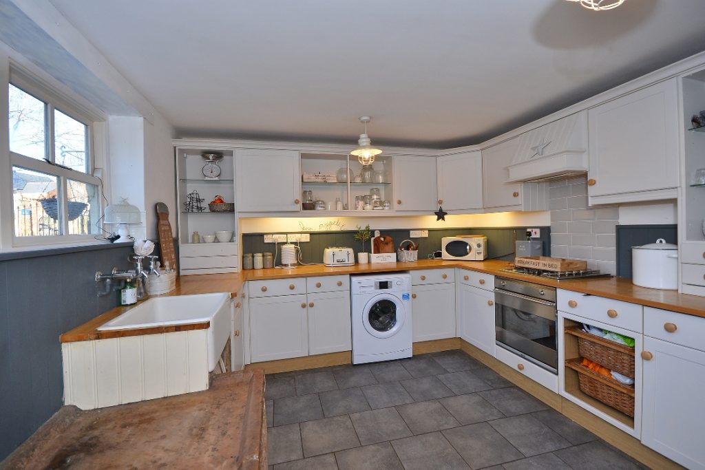 The kitchen is fitted with a range of country style shaker cabinets comprising wall cupboards including display cabinets, base units and drawers with wooden worktops above. There are integrated appliances including a Smeg oven, four-ring Smeg gas hob and extractor hood, fridge and dishwasher. There is also an inset Belfast sink, space for a fridge freezer and space and plumbing for a washing machine. With tiled floor, feature stone shelf / salting table, gas fired central heating boiler, two double glazed windows to the front elevation and a stable entrance door.
