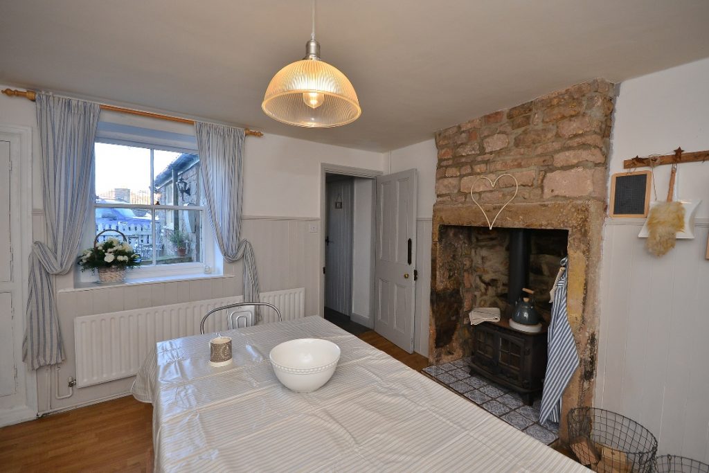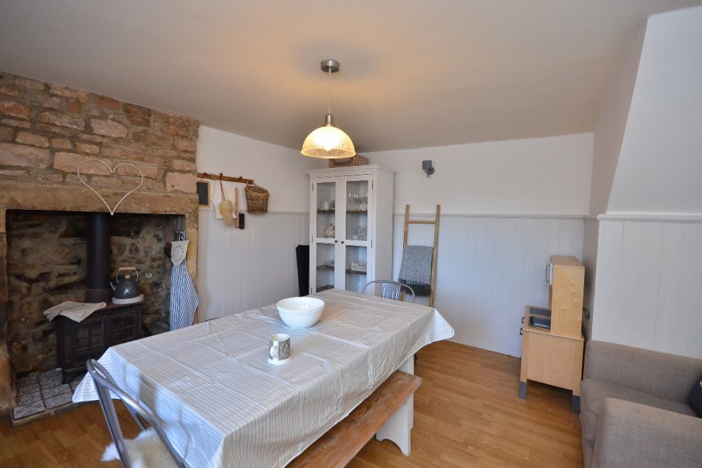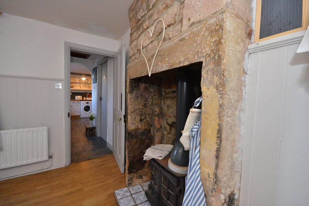 Ideal for both relaxed family meals or more formal entertaining, the cosy dining room has a stone fireplace with a quarry tiled hearth and inset log burner. With radiator, fitted storage cupboards and sash window to the rear elevation.
