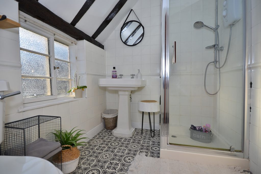 The shower room is fitted with a three-piece white suite comprising a fully tiled shower enclosure with a glazed door and Mira electric shower, pedestal wash hand basin and low flush W.C. With tiled walls, a radiator and an opaque glazed window to the rear elevation.