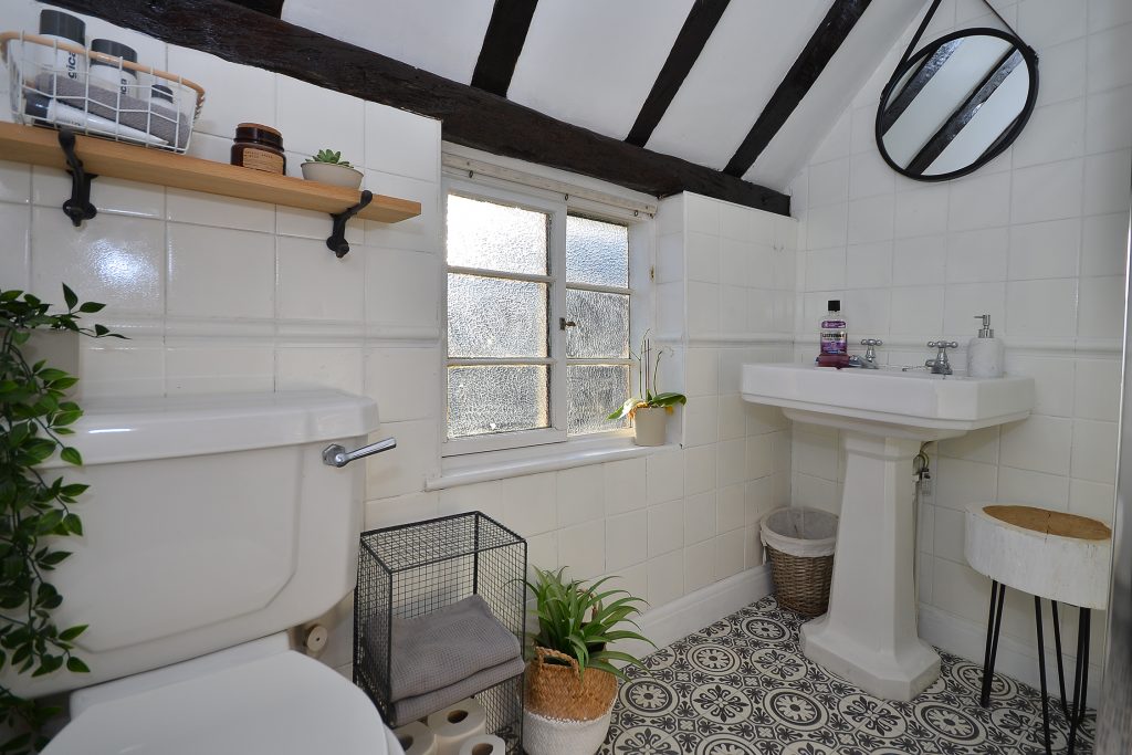 With a low flush W.C., wash hand basin and tiled splashbacks. Tiled floor, extractor fan, fitted shelving and three ceiling light points.