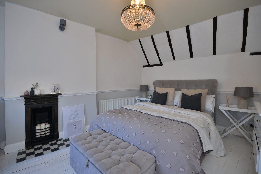 The stunning master bedroom suite has a feature fireplace, painted wooden floorboards, radiator and sash window to the front elevation overlooking the garden.