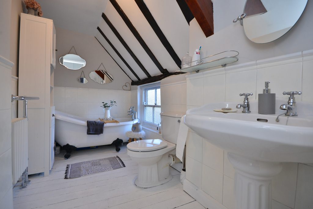 The en-suite bathroom is a tranquil place to relax with a roll-top bath. There is a pedestal wash hand bin, low flush W.C., part tiled walls, towel rail radiator, painted wooden floorboards and opaque sash window to the front elevation.